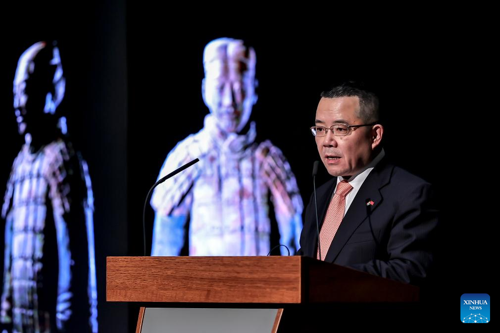 Chinese Ambassador to Hungary Gong Tao speaks during the opening ceremony of the exhibition "Civilization of the Qin and Han Dynasties - The First Chinese Emperor's Terracotta Warriors" in Budapest, Hungary, Nov. 27, 2025. The Museum of Fine Arts in Budapest on Thursday opened one of the most significant Chinese cultural exhibitions ever held in Hungary, presenting more than 150 ancient artworks from the Qin and Han dynasties (221 BC-220 AD), including ten original Terracotta Warriors.