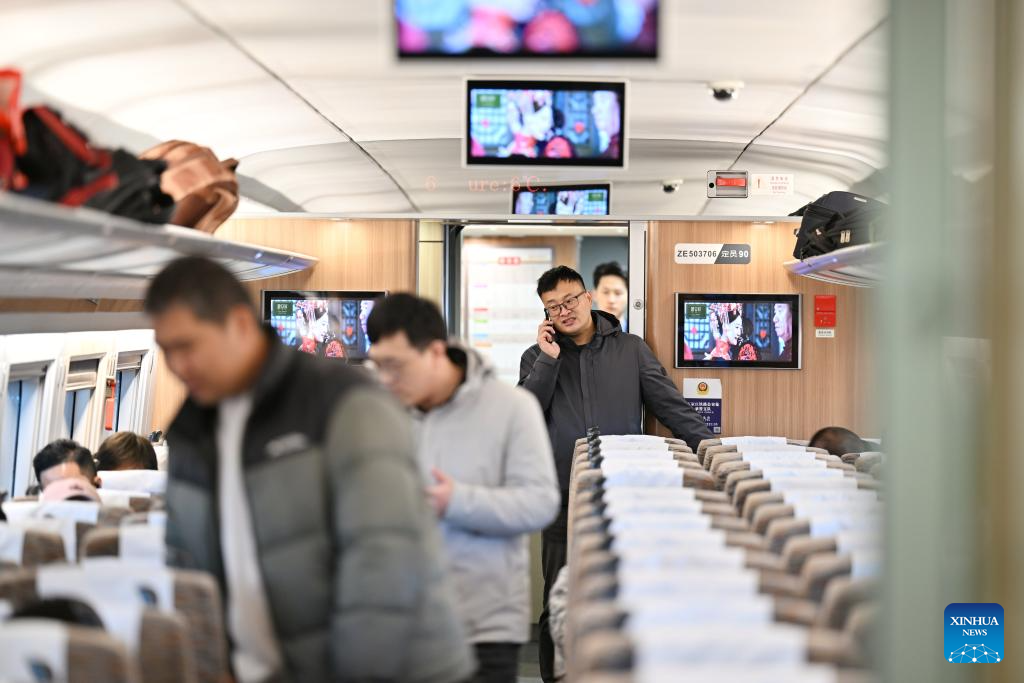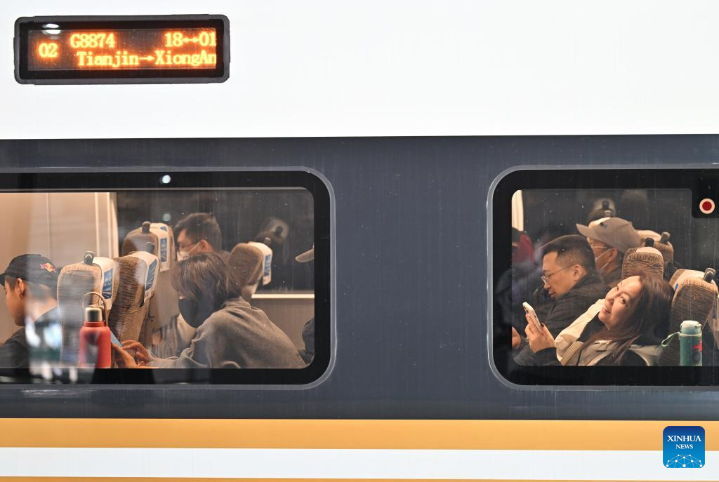 Passengers are pictured on a Tianjin-Daxing Airport Intercity Railway train, Nov. 25, 2025. Tianjin achieved significant progress in the construction of its high-speed rail intercity network during the 14th Five-Year Plan period (2021-2025). The "30-minute commuting circle" among Beijing, Tianjin and core area of Xiong'an, along with the "1-to-1.5-hour transportation circle" connecting major cities in the Beijing-Tianjin-Hebei region have turned into reality.