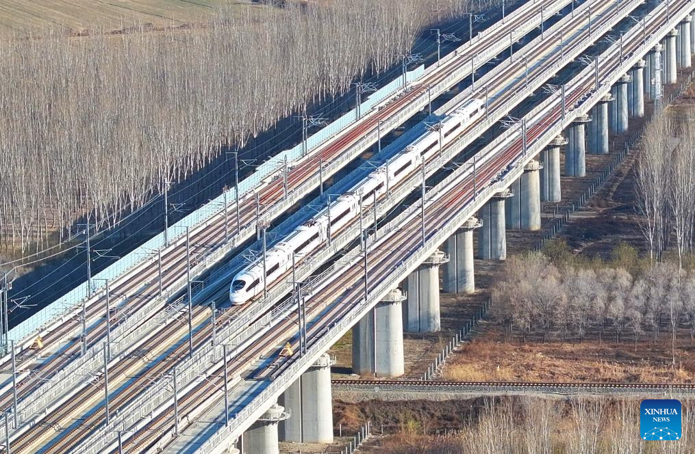 A train departs from Baodi Railway Station in Baodi District, north China's Tianjin, Nov. 25, 2025. Tianjin achieved significant progress in the construction of its high-speed rail intercity network during the 14th Five-Year Plan period (2021-2025). The "30-minute commuting circle" among Beijing, Tianjin and core area of Xiong'an, along with the "1-to-1.5-hour transportation circle" connecting major cities in the Beijing-Tianjin-Hebei region have turned into reality.