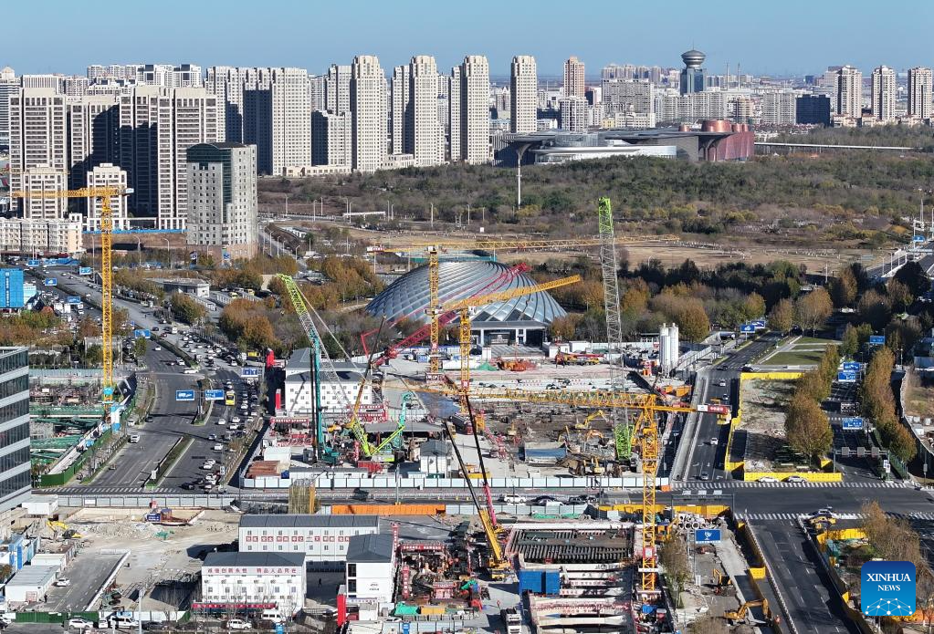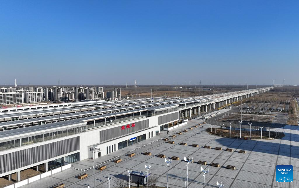 An aerial drone photo take on Nov. 25, 2025 shows a view of Baodi Railway Station in Baodi District, north China's Tianjin. Tianjin achieved significant progress in the construction of its high-speed rail intercity network during the 14th Five-Year Plan period (2021-2025). The "30-minute commuting circle" among Beijing, Tianjin and core area of Xiong'an, along with the "1-to-1.5-hour transportation circle" connecting major cities in the Beijing-Tianjin-Hebei region have turned into reality.