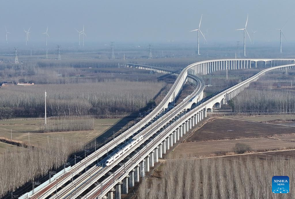 An aerial drone photo take on Nov. 25, 2025 shows a train running on Beijing-Tangshan intercity railway, in Baodi District, north China's Tianjin. Tianjin achieved significant progress in the construction of its high-speed rail intercity network during the 14th Five-Year Plan period (2021-2025). The "30-minute commuting circle" among Beijing, Tianjin and core area of Xiong'an, along with the "1-to-1.5-hour transportation circle" connecting major cities in the Beijing-Tianjin-Hebei region have turned into reality.