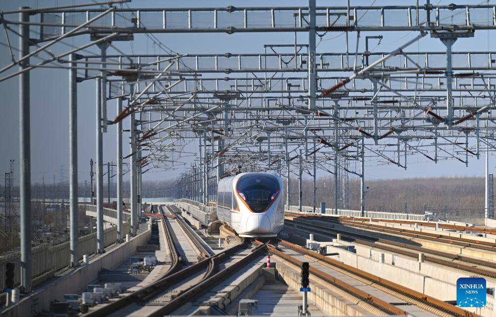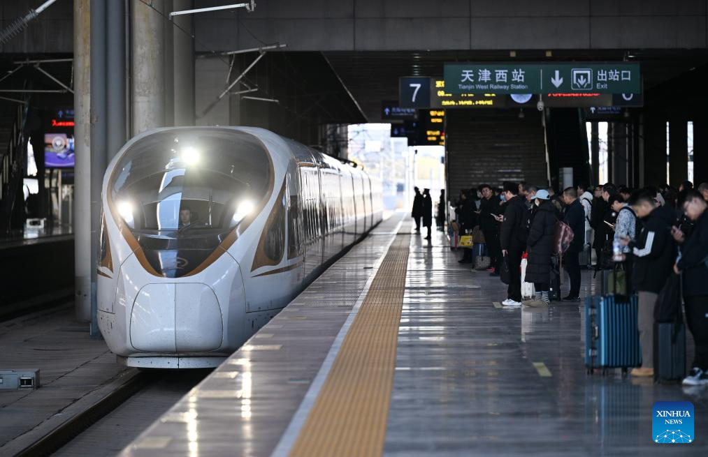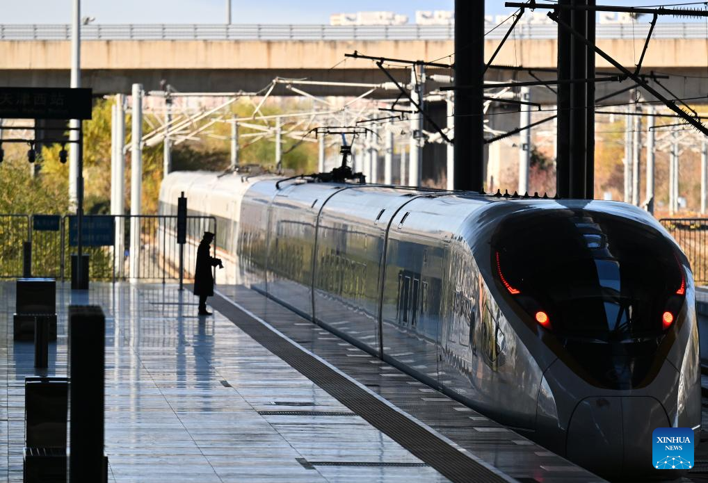 A train departs from Tianjin West Railway Station in Tianjin, north China, Nov. 25, 2025. Tianjin achieved significant progress in the construction of its high-speed rail intercity network during the 14th Five-Year Plan period (2021-2025). The "30-minute commuting circle" among Beijing, Tianjin and core area of Xiong'an, along with the "1-to-1.5-hour transportation circle" connecting major cities in the Beijing-Tianjin-Hebei region have turned into reality.