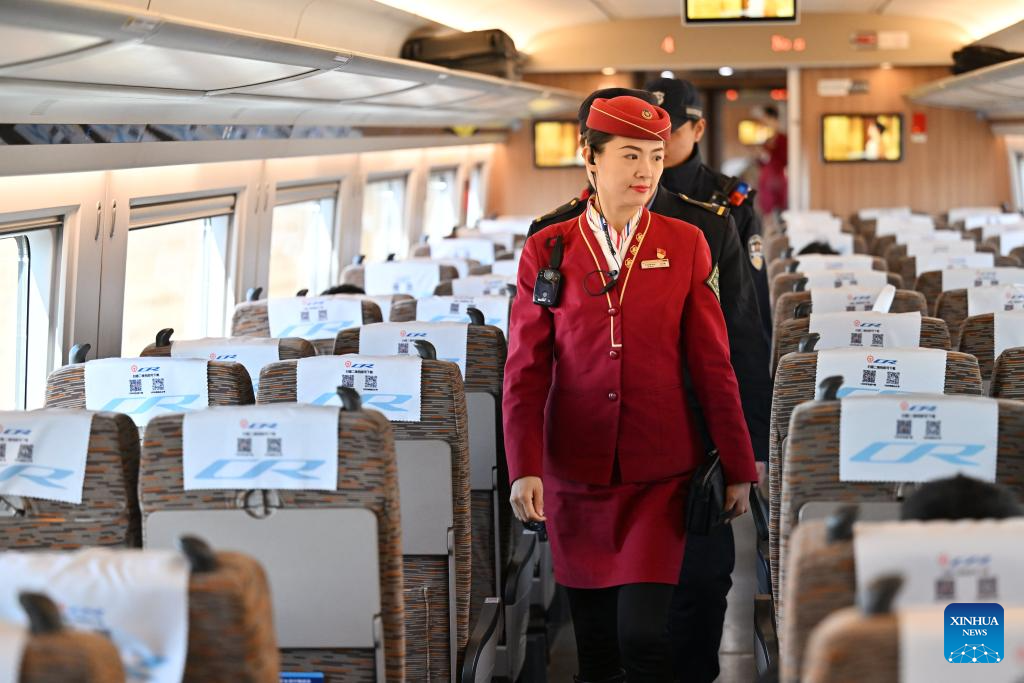 The conductor of a Tianjin-Daxing Airport Intercity Railway train patrols inside a carriage, Nov. 25, 2025. Tianjin achieved significant progress in the construction of its high-speed rail intercity network during the 14th Five-Year Plan period (2021-2025). The "30-minute commuting circle" among Beijing, Tianjin and core area of Xiong'an, along with the "1-to-1.5-hour transportation circle" connecting major cities in the Beijing-Tianjin-Hebei region have turned into reality.