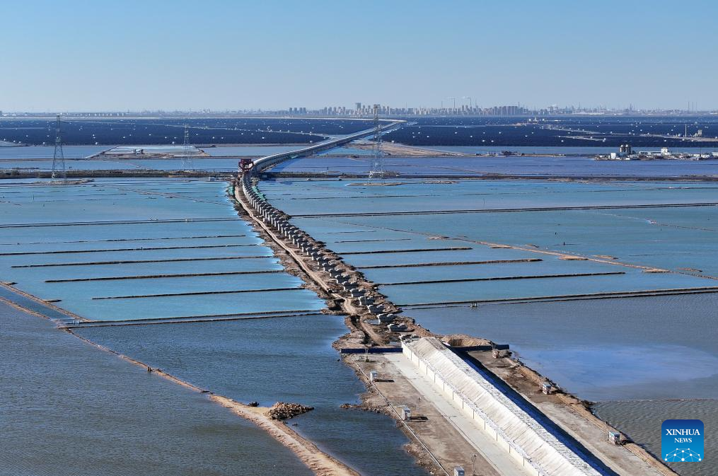 An aerial drone photo take on Nov. 27, 2025 shows the construction site of Tianjin-Weifang High-Speed Railway in Binhai New Area, north China's Tianjin. Tianjin achieved significant progress in the construction of its high-speed rail intercity network during the 14th Five-Year Plan period (2021-2025). The "30-minute commuting circle" among Beijing, Tianjin and core area of Xiong'an, along with the "1-to-1.5-hour transportation circle" connecting major cities in the Beijing-Tianjin-Hebei region have turned into reality.