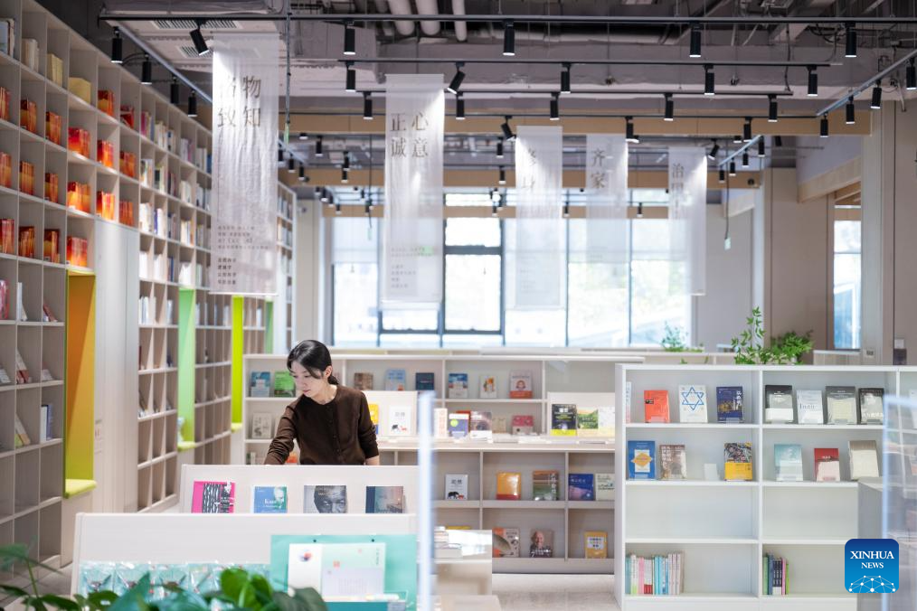 A staff member arranges books at a book store in Wenhua community in Xiong'an New Area, north China's Hebei Province, Nov. 25, 2025. The Xiong'an New Area, designed to relieve Beijing of its non-essential functions, has been leveraging smart and considerate public services to facilitate daily life of relocated residents.