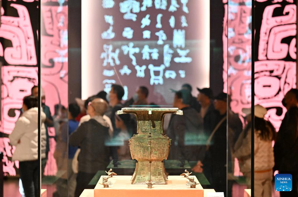 A visitor views exhibits at an exhibition on cultural relics from the Shang Dynasty (1600 BC-1046 BC) at the Tianjin Museum in Tianjin, north China, Nov. 29, 2025. The exhibition, featuring more than 180 pieces (sets) of cultural relics from the Shang Dynasty, has received more than 400,000 visitors since its opening on Aug. 23. (Xinhua/Li Ran)