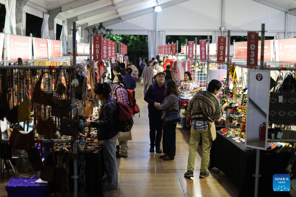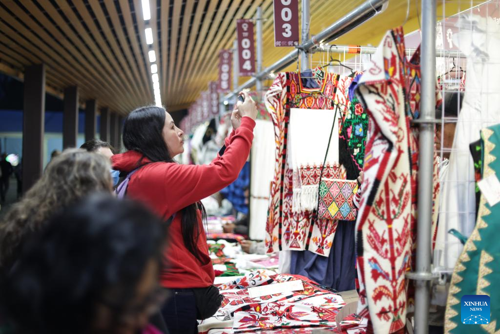 A Chinese artisan displays a handicraft at an original Mexican textile art fair in Mexico City, Mexico, Nov. 28, 2025. The fair brings together artisans from all across Mexico presenting textiles, jewelry, and other handcrafted items. International artisans from several countries, including China, were also invited. (Photo by Francisco Canedo/Xinhua)