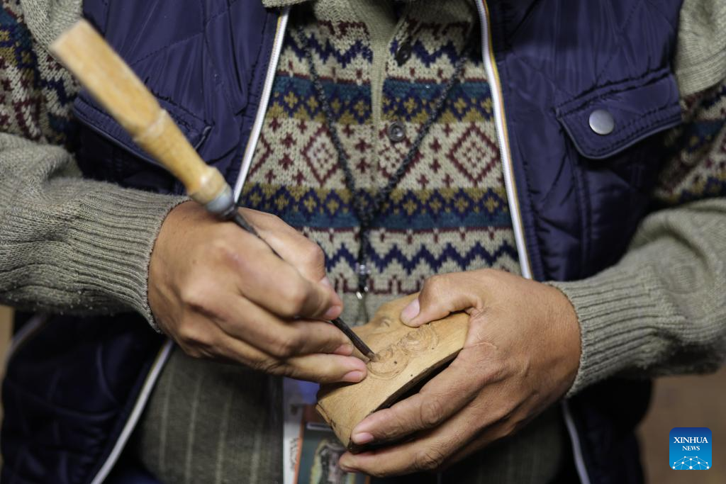 An artisan displays a handicraft at an original Mexican textile art fair in Mexico City, Mexico, Nov. 28, 2025. The fair brings together artisans from all across Mexico presenting textiles, jewelry, and other handcrafted items. International artisans from several countries, including China, were also invited. (Photo by Francisco Canedo/Xinhua)