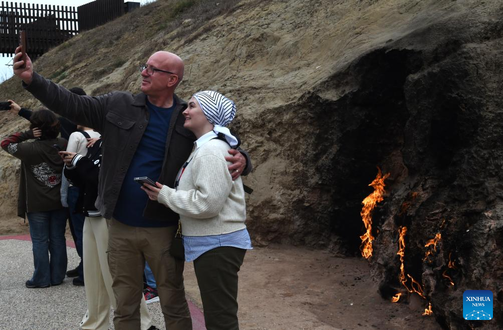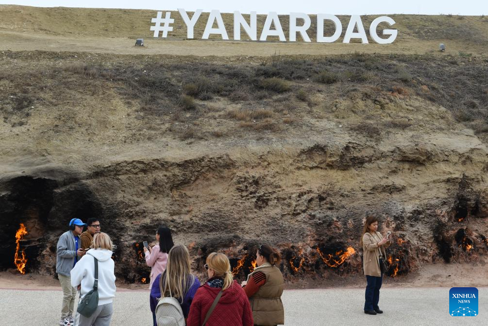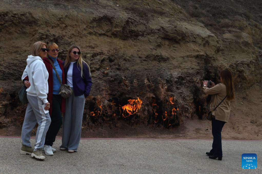 Tourists pose for photos at Yanardag on the Absheron Peninsula in Azerbaijan, Nov. 28, 2025. Known as "the burning mountain," Yanardag is a national natural heritage site of Azerbaijan. The everlasting flames here originate from natural gas that leaks through rock fissures. (Xinhua/Chen Junfeng)