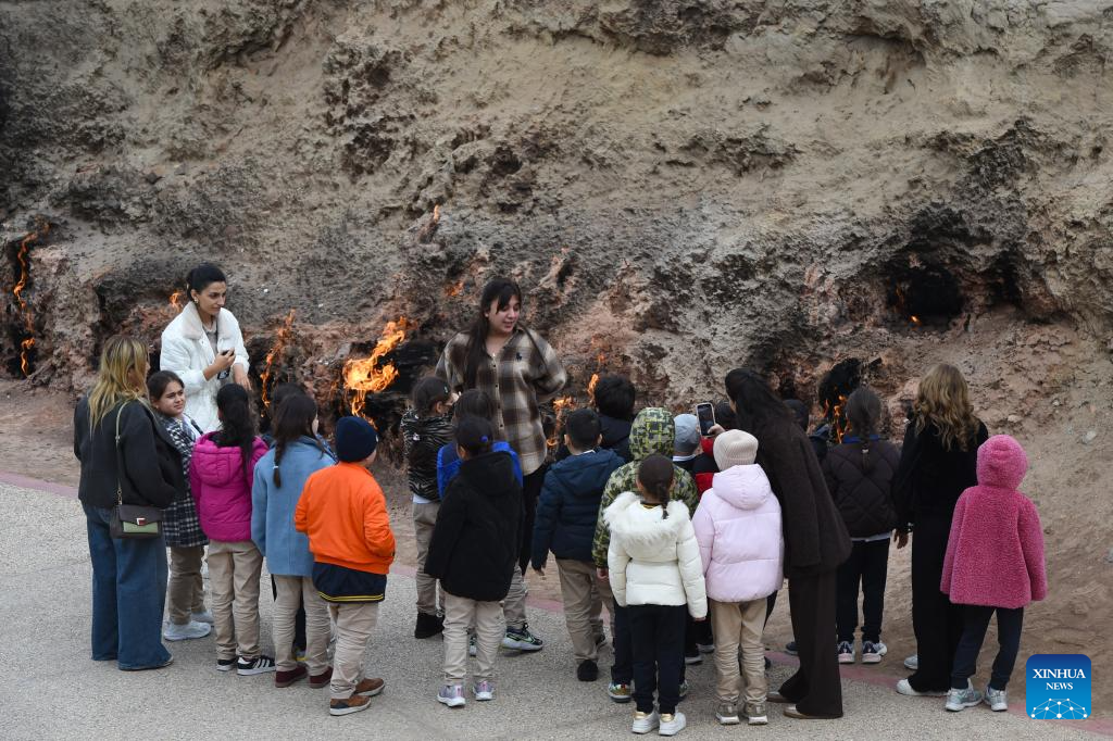 Tourists visit Yanardag on the Absheron Peninsula in Azerbaijan, Nov. 28, 2025. Known as "the burning mountain," Yanardag is a national natural heritage site of Azerbaijan. The everlasting flames here originate from natural gas that leaks through rock fissures. (Xinhua/Chen Junfeng)
