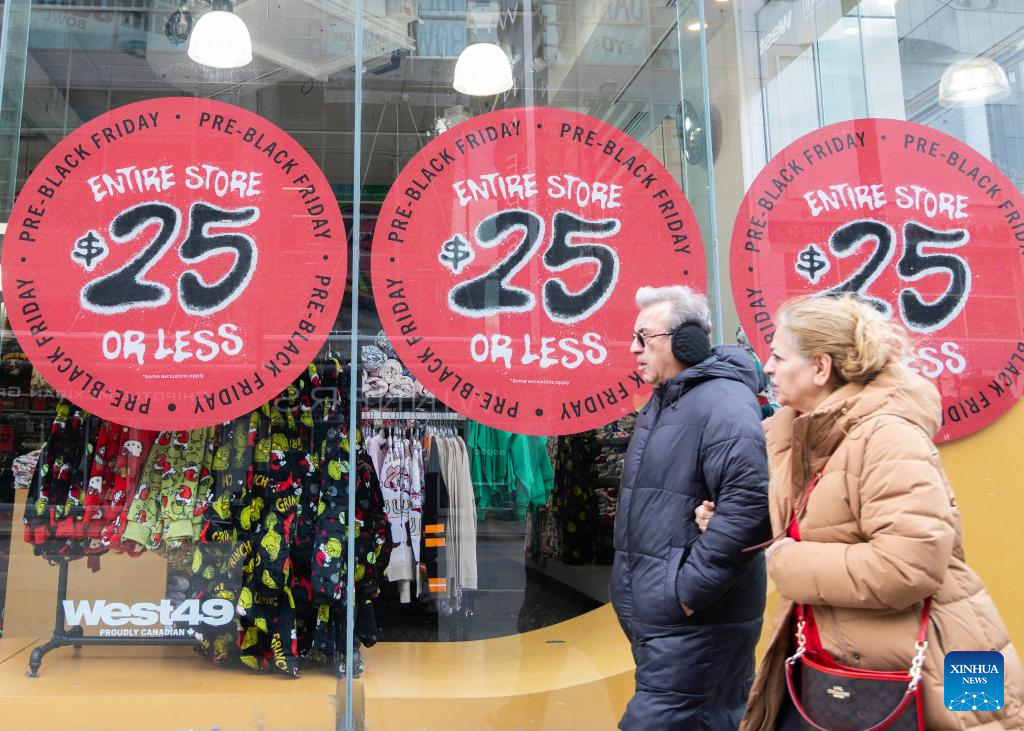 People walk past a promotion sign of a shop during Black Friday sales event in Toronto, Canada, Nov. 28, 2025. (Photo by Zou Zheng/Xinhua)