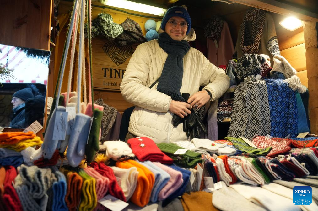 A vendor sells handcraft products at a Christmas market in Riga, Latvia, Nov. 28, 2025. The Christmas Market in the Dome Square of Riga Old Town, Latvia opened on the 28th, kicking off the Christmas and New Year festivals. (Photo by Edijs Palens/Xinhua)