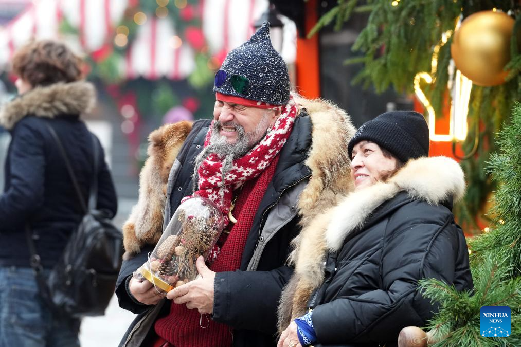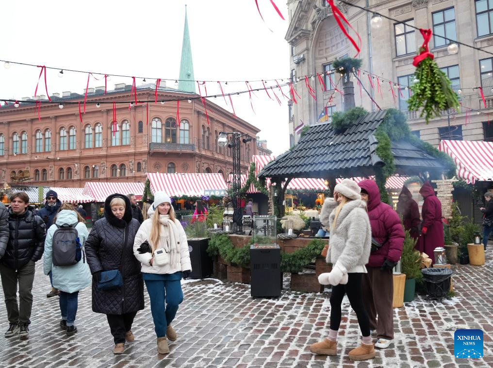People visit Christmas market in Riga, Latvia, Nov. 28, 2025. The Christmas Market in the Dome Square of Riga Old Town, Latvia opened on the 28th, kicking off the Christmas and New Year festivals. (Photo by Edijs Palens/Xinhua)