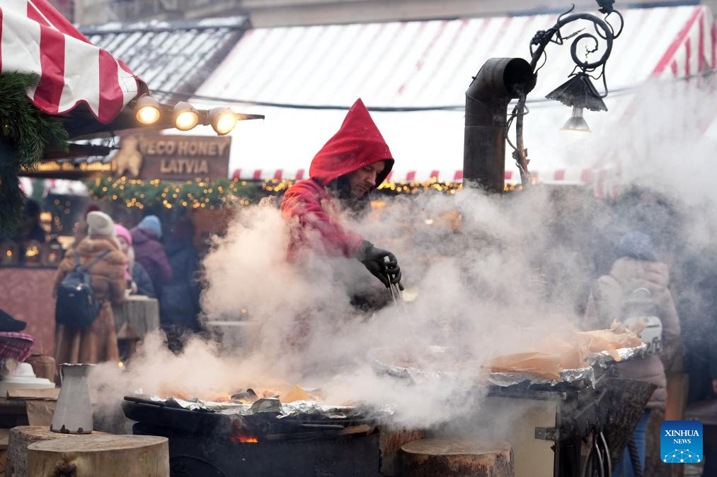 A vendor sells food at a Christmas market in Riga, Latvia, Nov. 28, 2025. The Christmas Market in the Dome Square of Riga Old Town, Latvia opened on the 28th, kicking off the Christmas and New Year festivals. (Photo by Edijs Palens/Xinhua)