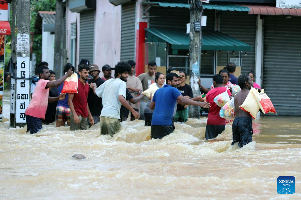 People transfer goods in floodwater after heavy rains on the outskirts of Colombo, Sri Lanka, on Nov. 29, 2025. Sri Lankan President Anura Kumara Dissanayake has declared a State of Public Emergency effective on Friday, as the country confronts one of its worst weather-related disasters in recent years. (Photo by Ajith Perera/Xinhua)