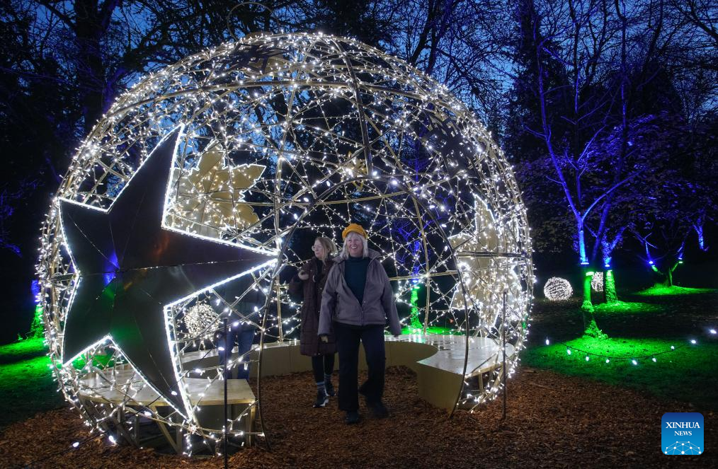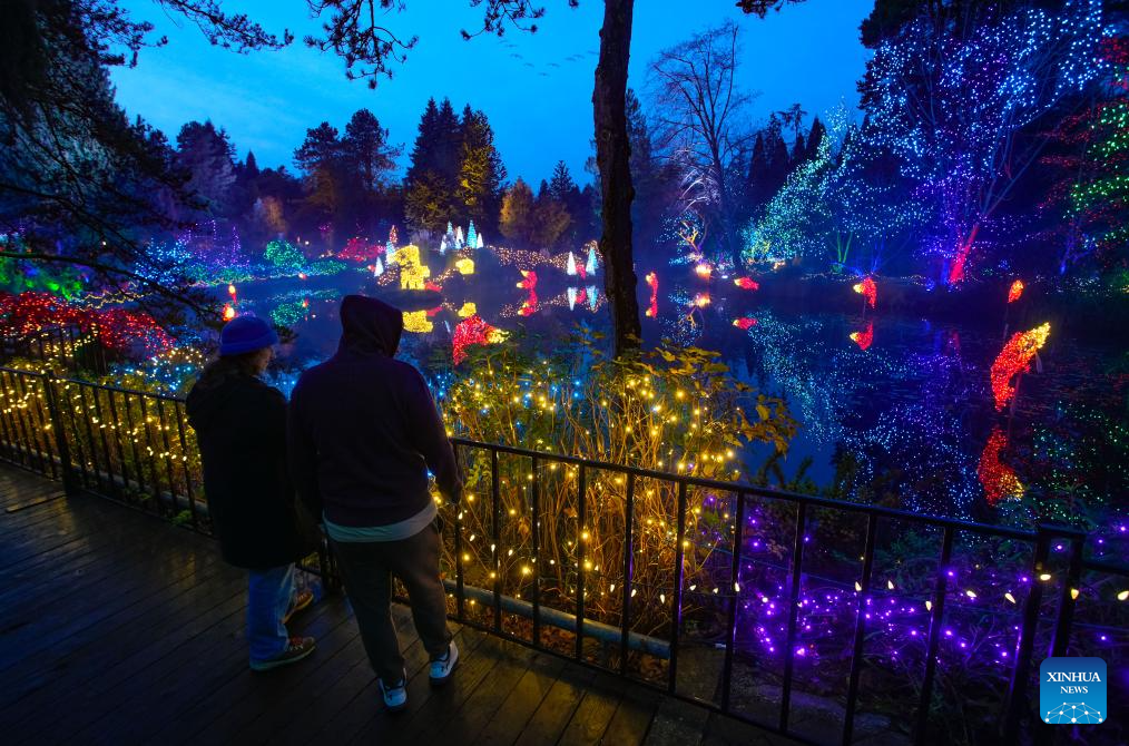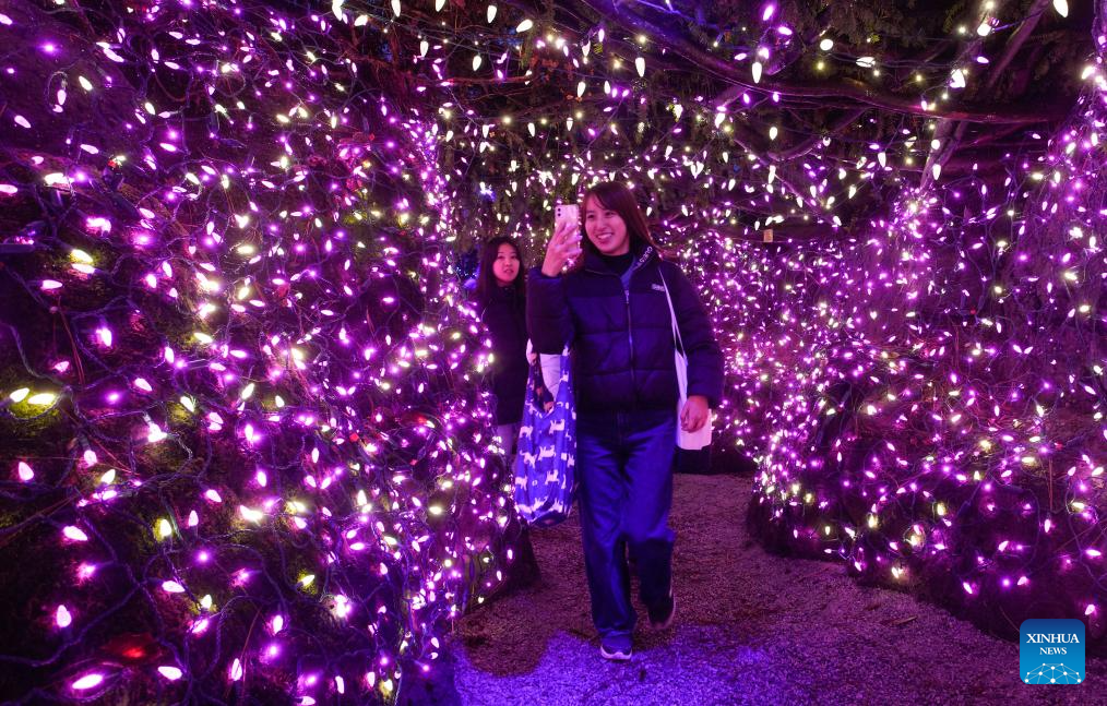 People enjoy the light installations at VanDusen Botanical Garden during the annual Festival of Lights in Vancouver, British Columbia, Canada, Nov. 28, 2025. The annual holiday event kicked off here on Friday, with over 1 million lights transforming the garden into a dazzling holiday spectacle. (Photo by Liang Sen/Xinhua)