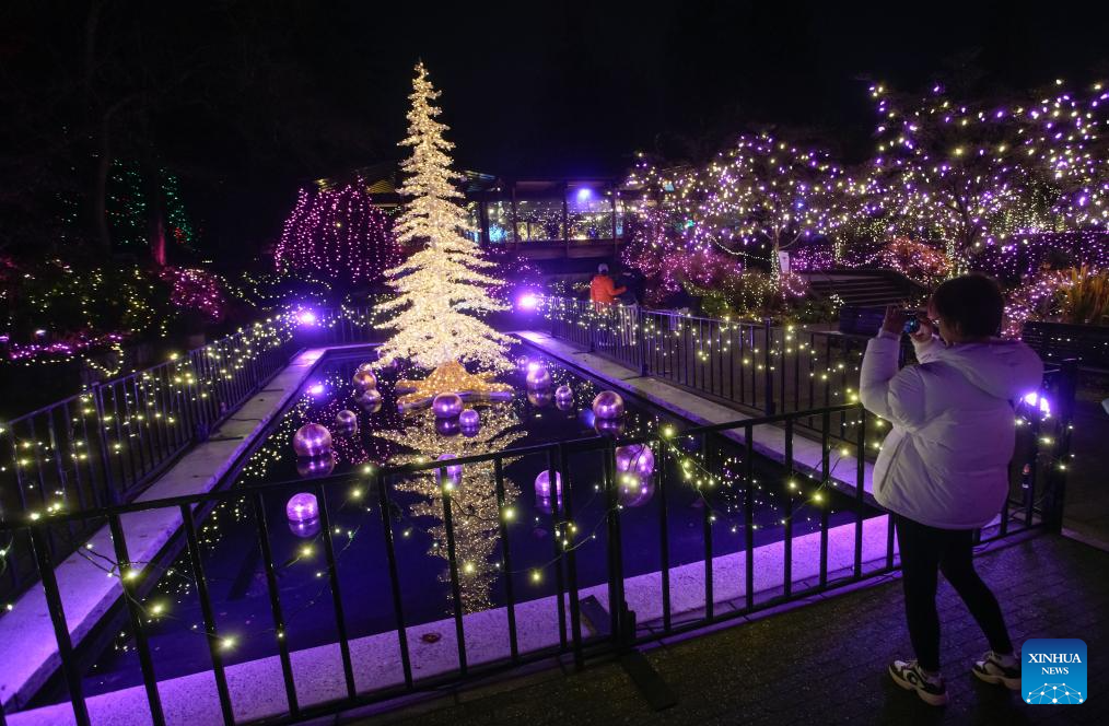 A visitor takes photos of the light installations at VanDusen Botanical Garden during the annual Festival of Lights in Vancouver, British Columbia, Canada, Nov. 28, 2025. The annual holiday event kicked off here on Friday, with over 1 million lights transforming the garden into a dazzling holiday spectacle. (Photo by Liang Sen/Xinhua)