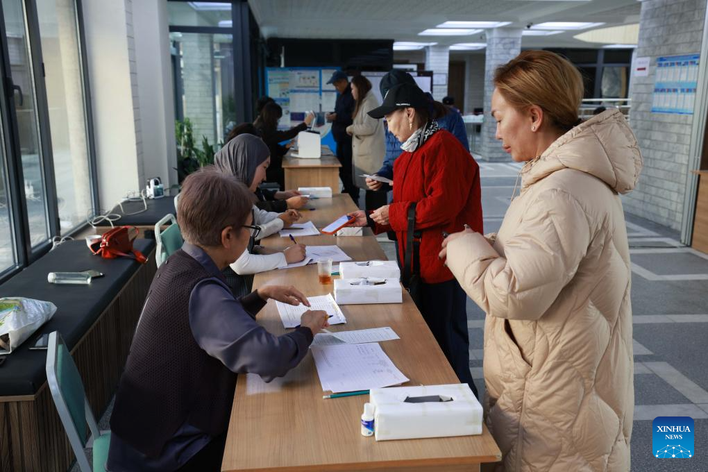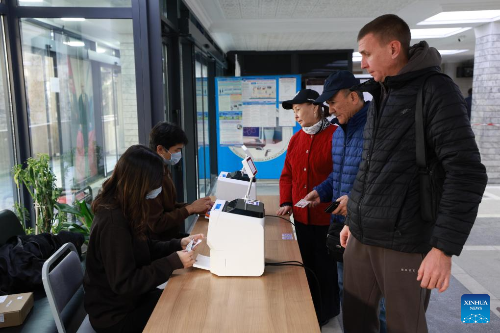 Voters register at a polling station in Bishkek, Kyrgyzstan, on Nov. 30, 2025. Early parliamentary elections began in Kyrgyzstan on Sunday to elect 90 deputies to the country's unicameral legislature. (Photo by Roman/Xinhua)