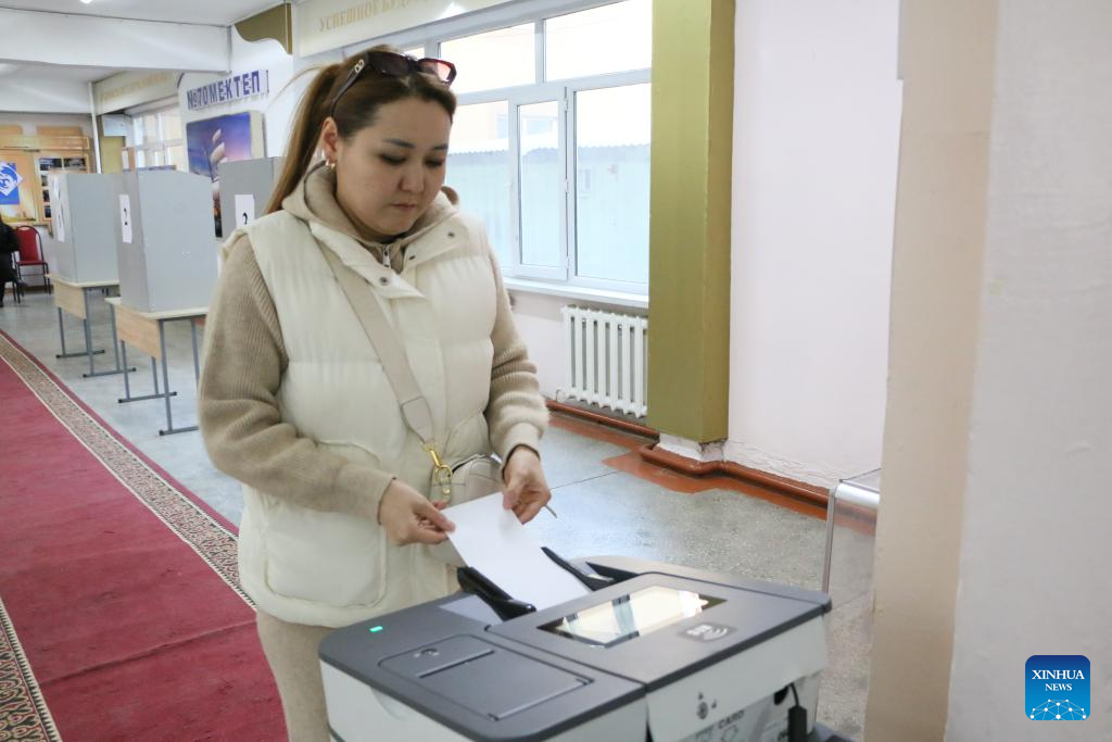 A voter casts her ballot at a polling station in Bishkek, Kyrgyzstan, on Nov. 30, 2025. Early parliamentary elections began in Kyrgyzstan on Sunday to elect 90 deputies to the country's unicameral legislature. (Xinhua/Jiang Youlin)