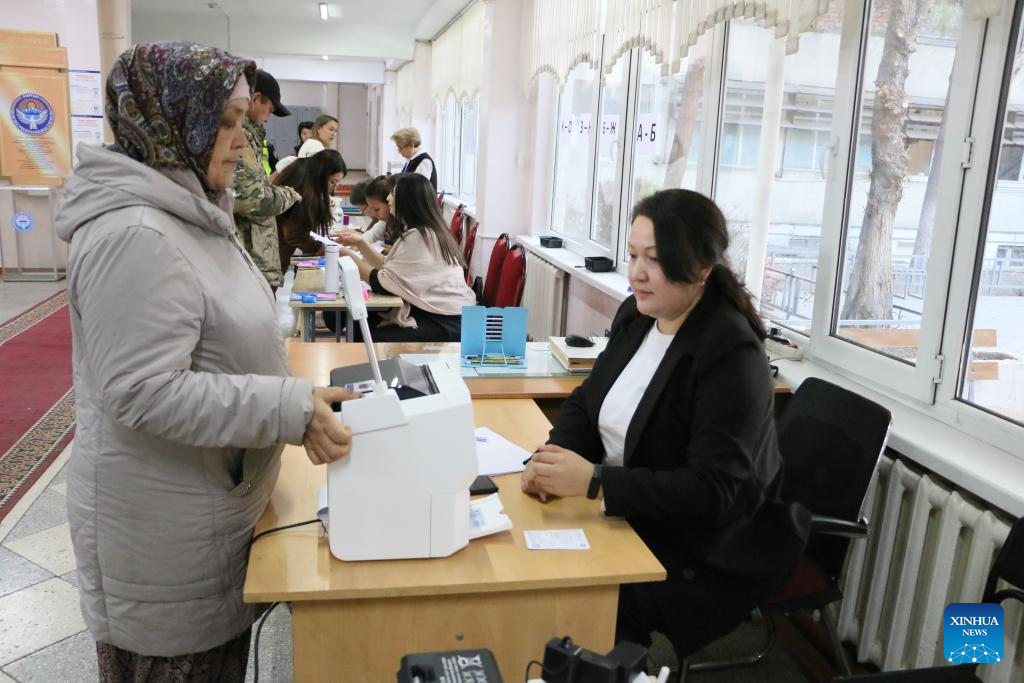 A voter has her identity verified at a polling station in Bishkek, Kyrgyzstan, on Nov. 30, 2025. Early parliamentary elections began in Kyrgyzstan on Sunday to elect 90 deputies to the country's unicameral legislature. (Xinhua/Jiang Youlin)