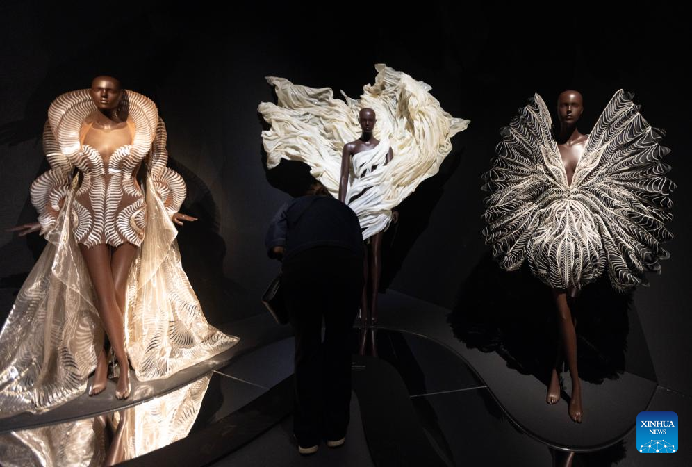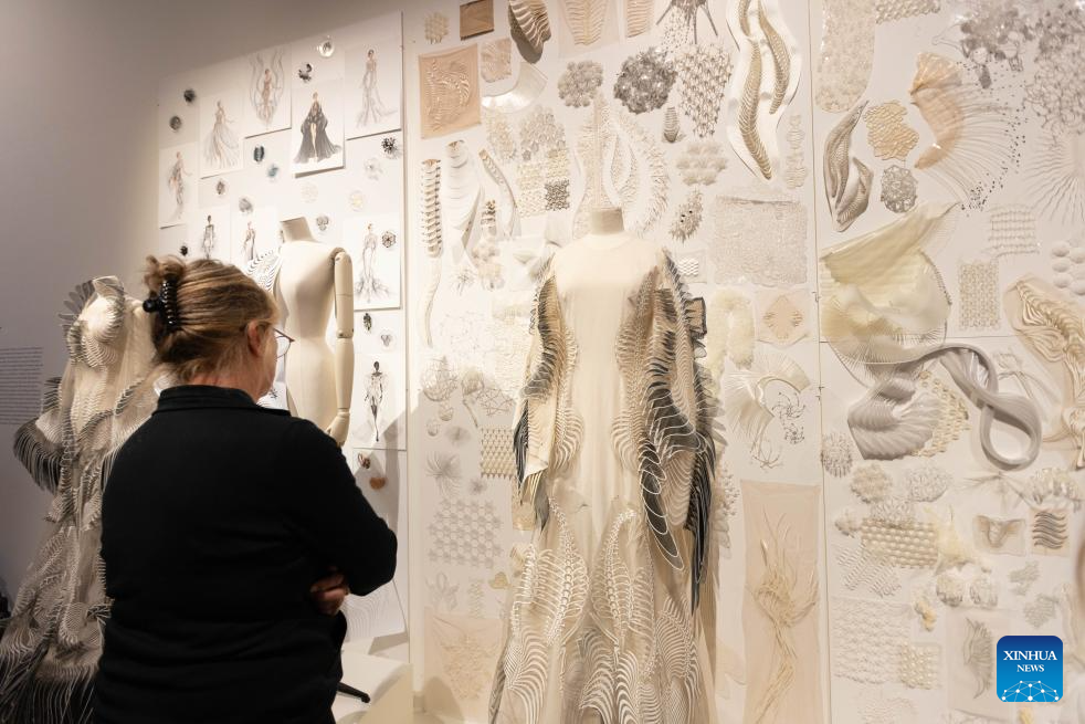 An exhibition themed "Sculpting the Senses" is held in Rotterdam, the Netherlands, Nov. 29, 2025. The exhibition shows the works of Dutch fashion designer Iris van Herpen. (Photo by Sylvia Lederer/Xinhua)