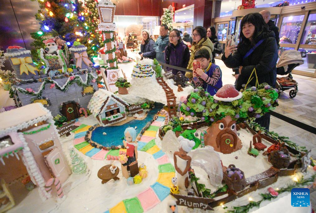 People look at gingerbread house creations during the annual "Gingerbread Lane" event in Vancouver, British Columbia, Canada, Nov. 29, 2025. Canada's longest-running gingerbread house display event returned for its 33rd year, featuring more than 30 gingerbread houses and inviting the public to vote for their favourite creations crafted by professional bakers, culinary artists, and culinary school students. (Photo by Liang Sen/Xinhua)