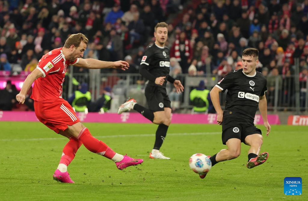 ( Harry Kane (L) of FC Bayern Munich vies with Arkadiusz Pyrka (R) of FC St. Pauli during the German first division Bundesliga football match between FC Bayern Munich and FC St. Pauli in Munich, Germany, Nov. 29, 2025. (Photo by Philippe Ruiz/Xinhua)