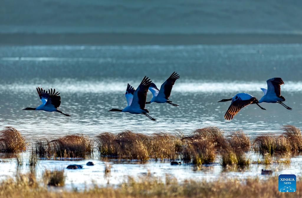 Black-necked cranes fly over a wetland of the Yunnan Dashanbao National Nature Reserve for Black-necked Cranes in Zhaotong City, southwest China's Yunnan Province, on Nov. 30, 2025. Yunnan Dashanbao National Nature Reserve for Black-necked Cranes is a significant wintering habitat and transfer station for migratory black-necked cranes on the Yunnan-Guizhou Plateau. At present, more than a thousand black-necked cranes have flown to the nature reserve to winter here. (Photo by Fan Hui/Xinhua)