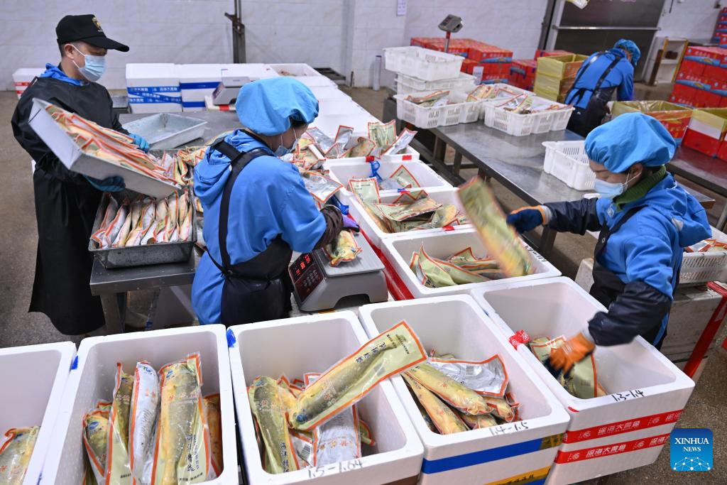 Workers of an aquatic product company process large yellow croakers in Xiapu County, southeast China's Fujian Province, Nov. 28, 2025.