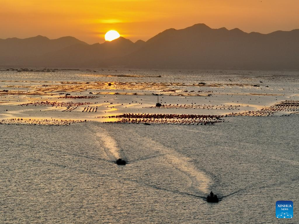 An aerial drone photo shows fishing boats sailing from a fish farm in Xiapu County, southeast China's Fujian Province, Nov. 28, 2025.