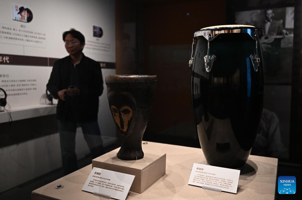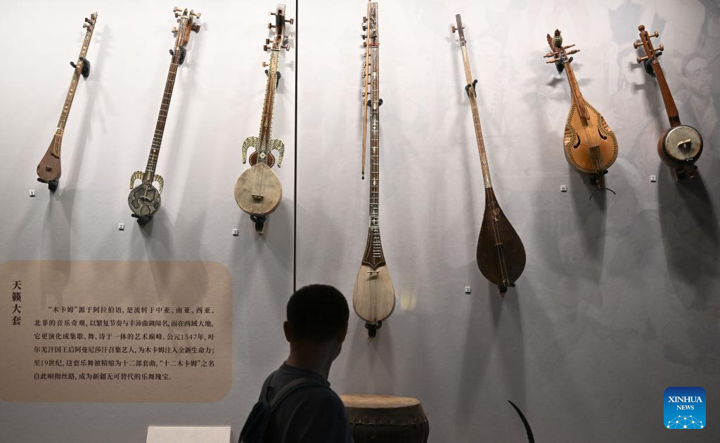 Musical instruments are on display during an exhibition themed on various music cultures along the ancient Silk Road at Guangzhou Maritime Museum in Guangzhou, south China's Guangdong Province, Nov. 29, 2025. The exhibition kicked off here on Saturday, showcasing 143 ancient musical instruments from countries along the Silk Road. The exhibition, which will run until April 6, 2026, presents the historical context and artistic integration of musical instruments in the cultural exchanges between the East and the West. (Xinhua/Deng Hua)