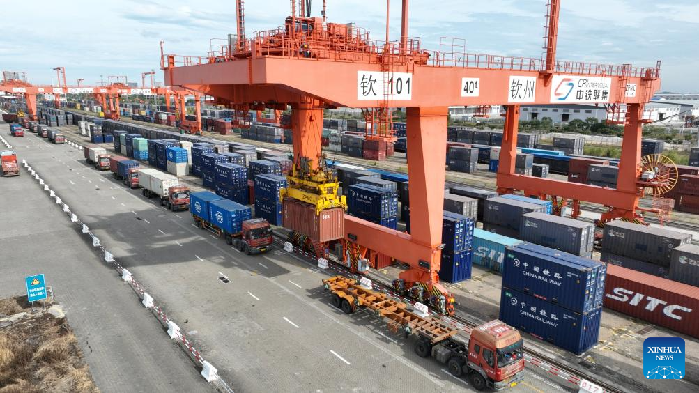 A drone photo taken on Nov. 11, 2025 shows trucks queuing to transfer containers at a railway container center in Qinzhou, south China's Guangxi Zhuang Autonomous Region. The New International Land-Sea Trade Corridor (ILSTC), a key logistics route connecting western China to global markets, had transported a cumulative total of more than 5 million twenty-foot equivalent units (TEUs) of cargo as of Saturday, according to China Railway Nanning Group Co., Ltd. (Xinhua/Zhang Ailin)