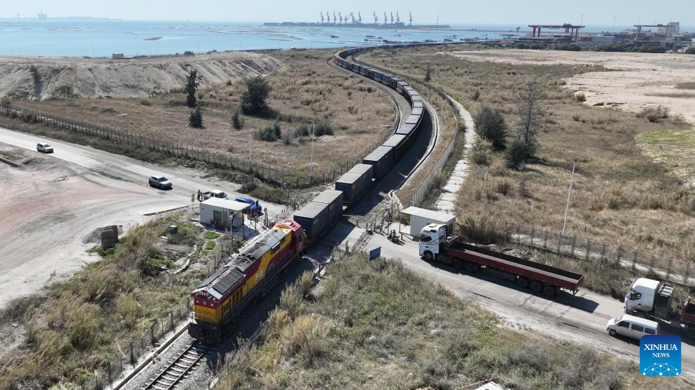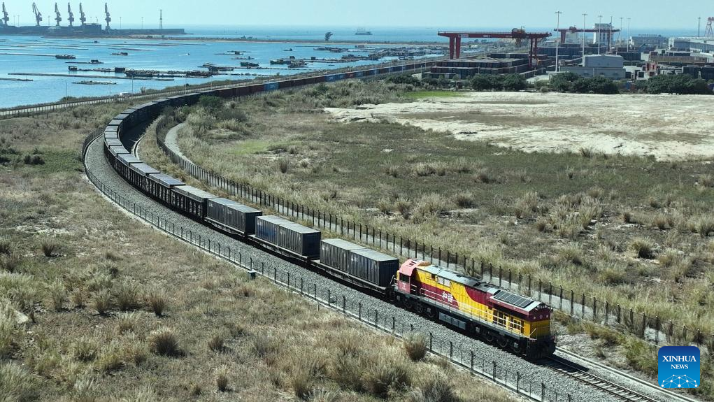 A drone photo taken on Nov. 29, 2025 shows a train of the New International Land-Sea Trade Corridor (ILSTC) in Qinzhou City, south China's Guangxi Zhuang Autonomous Region. The ILSTC, a key logistics route connecting western China to global markets, had transported a cumulative total of more than 5 million twenty-foot equivalent units (TEUs) of cargo as of Saturday, according to China Railway Nanning Group Co., Ltd. (Xinhua/Zhang Ailin)