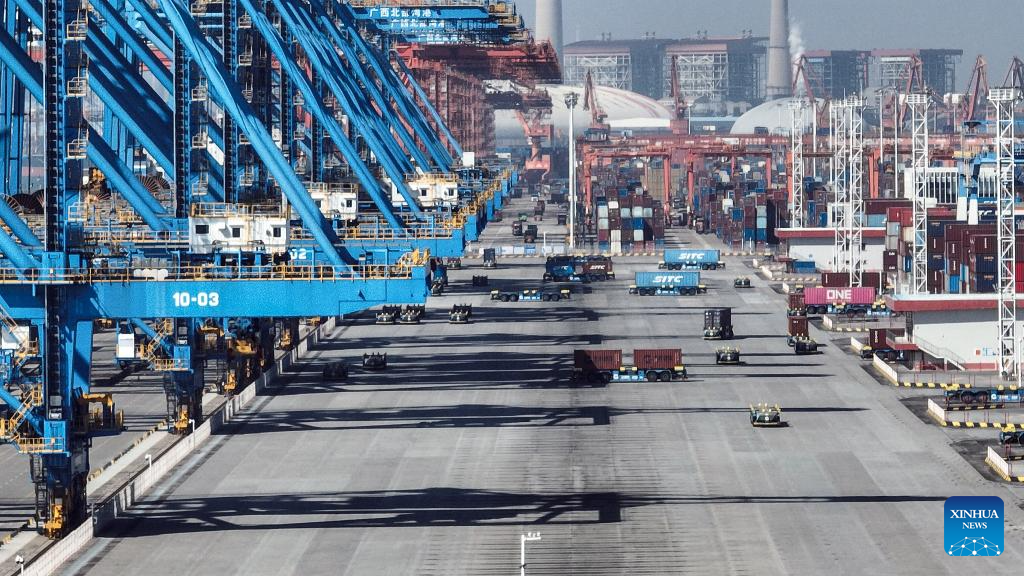A drone photo taken on Nov. 29, 2025 shows smart transferring vehicles at the Qinzhou Port in Qinzhou City, south China's Guangxi Zhuang Autonomous Region. The New International Land-Sea Trade Corridor (ILSTC), a key logistics route connecting western China to global markets, had transported a cumulative total of more than 5 million twenty-foot equivalent units (TEUs) of cargo as of Saturday, according to China Railway Nanning Group Co., Ltd. (Xinhua/Zhang Ailin)