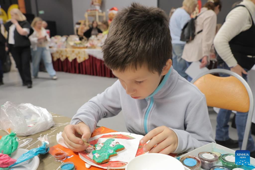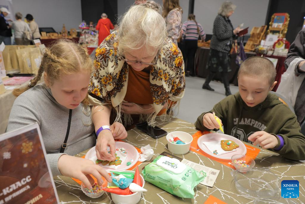 Children experience making gingerbread cookies during the 10th "Gingerbread World" International Art Festival in St. Petersburg, Russia, Nov. 30, 2025. (Photo by Irina Motina/Xinhua)