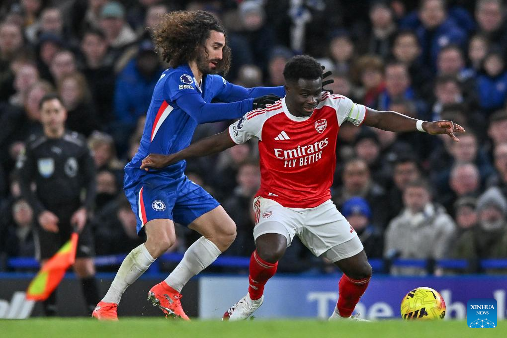 Marc Cucurella (R) of Chelsea vies with Bukayo Saka of Arsenal during the English Premier League match between Arsenal FC and Chelsea FC in London, Britain, on Nov. 30, 2025. (Xinhua)