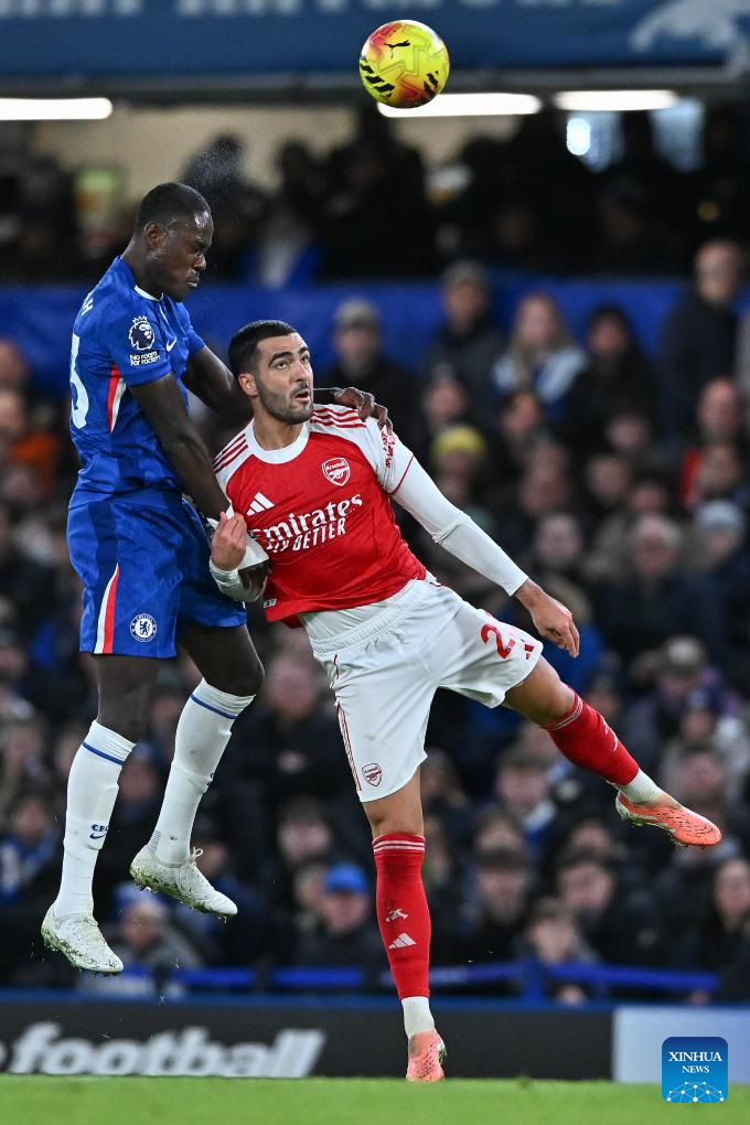 Chelsea's Trevoh Chalobah (L) vies with Arsenal's Mikel Merino during the English Premier League match between Arsenal FC and Chelsea FC in London, Britain, on Nov. 30, 2025. (Xinhua)