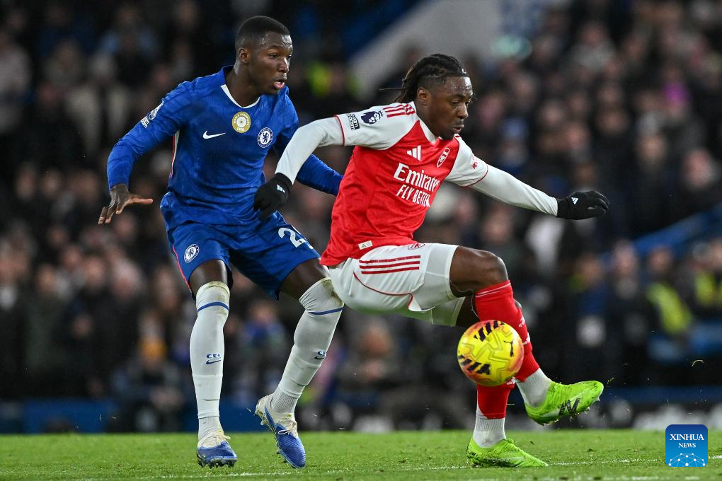 Arsenal's Cristhian Mosquera (L) vies with Chelsea's Joao Pedro during the English Premier League match between Arsenal FC and Chelsea FC in London, Britain, on Nov. 30, 2025. (Xinhua)