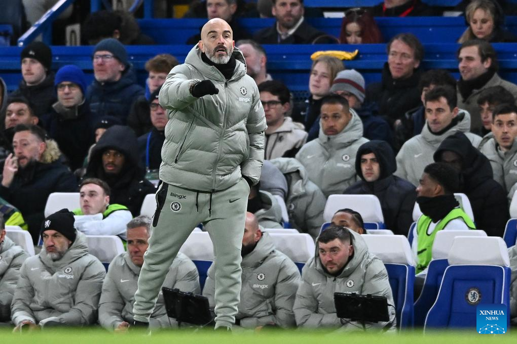 Chelseal's head coach Enzo Maresca gestures during the English Premier League match between Arsenal FC and Chelsea FC in London, Britain, on Nov. 30, 2025. (Xinhua)