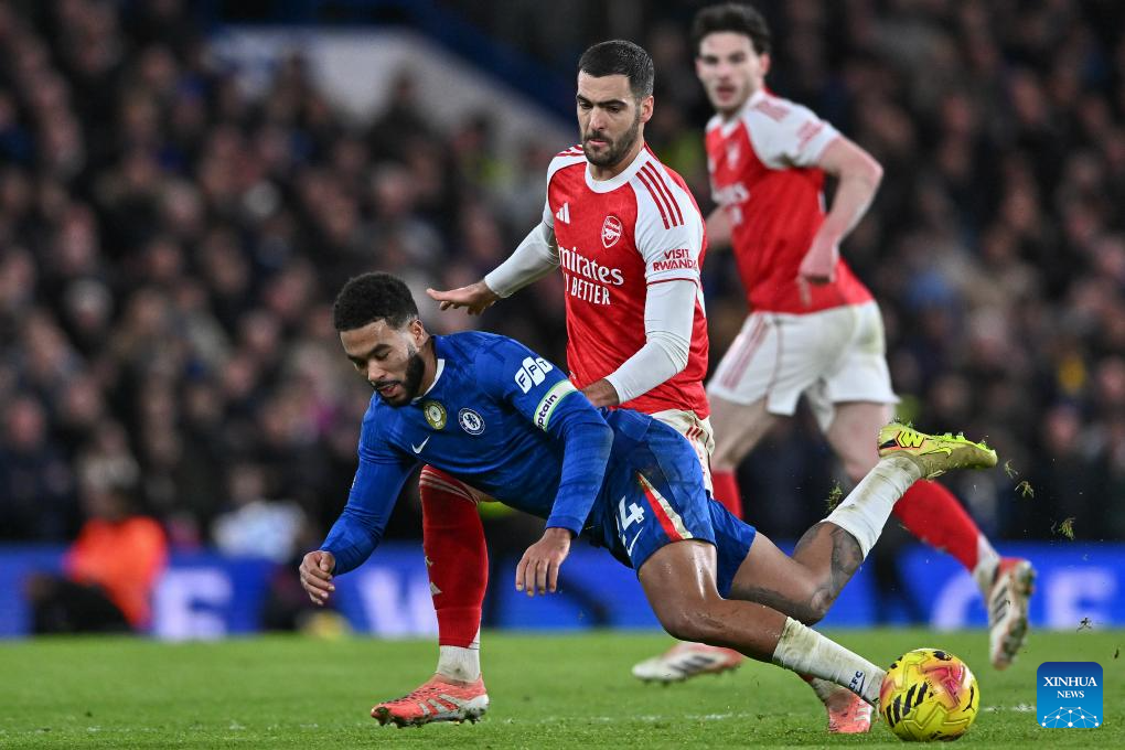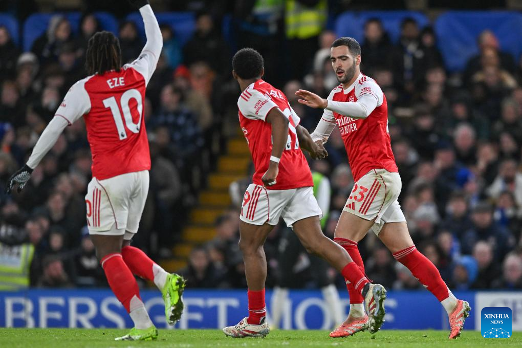 Mikel Merino (C) of Arsenal vies with Reece James of Chelsea during the English Premier League match between Arsenal FC and Chelsea FC in London, Britain, on Nov. 30, 2025. (Xinhua)
