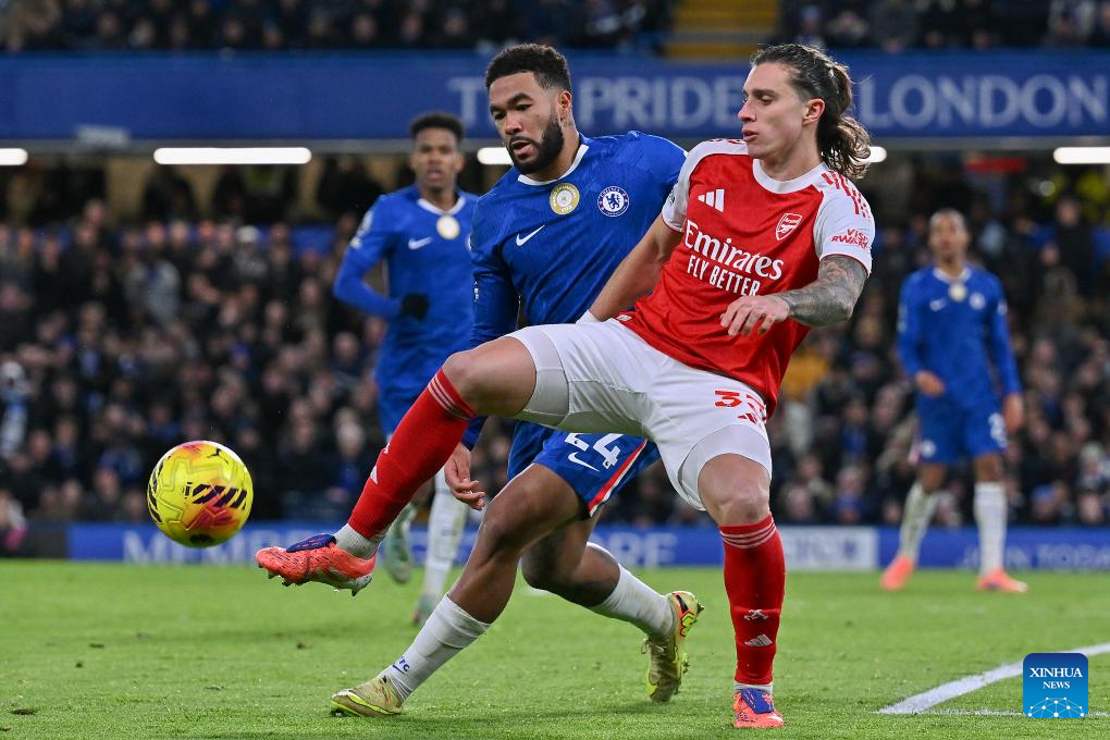 Riccardo Calafiori (F) of Arsenal vies with Reece James of Chelsea during the English Premier League match between Arsenal FC and Chelsea FC in London, Britain, on Nov. 30, 2025. (Xinhua)