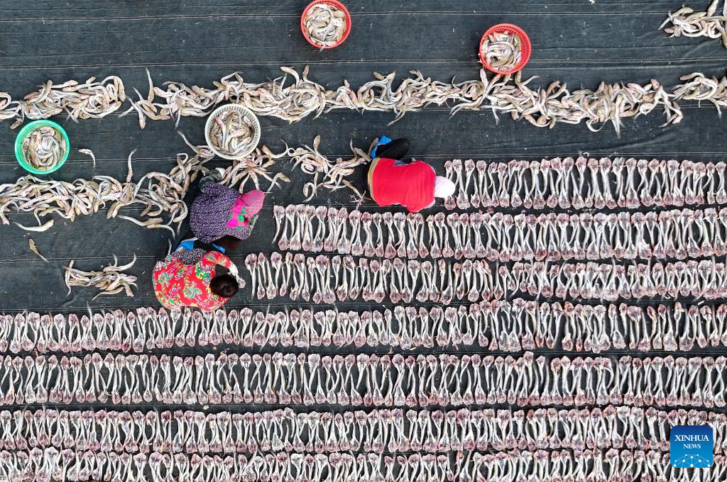 The locals air fish in Heiyanzi Town in Fengnan District of Tangshan City, north China's Hebei Province, Nov. 30, 2025. Fishermen take advantage of the fine weather to process and dry fish, shrimp and other seafood to supply the market. (Xinhua/Yang Shiyao)