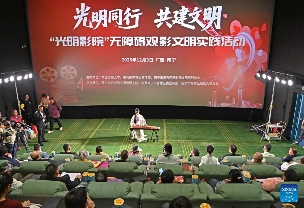 A volunteer plays Guzheng, a traditional Chinese musical instrument, before a movie starts at a cinema in Nanning, south China's Guangxi Zhuang Autonomous Region, Dec. 3, 2025. Wednesday marks the 34th International Day of Persons with Disabilities. More than 40 visually-impaired people enjoyed a barrier-free version of the movie "One and Only" under the Cinema of Light, a public welfare initiative initiated in 2017 by the Communication University of China.