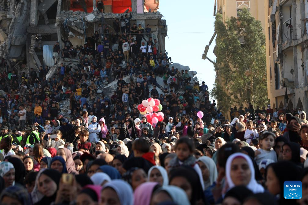 People watch a Palestinian mass wedding in the southern Gaza Strip city of Khan Younis, Dec. 2, 2025. Fifty-four couples attended the event. (Photo by Rizek Abdeljawad/Xinhua)