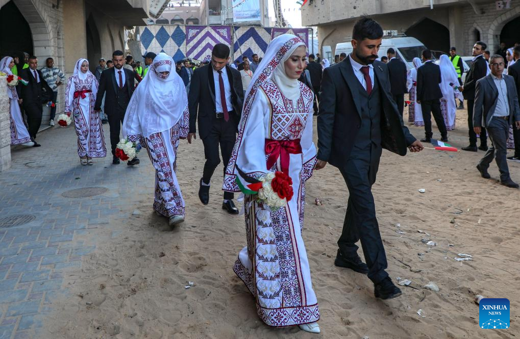 Palestinian grooms and brides celebrate together a mass wedding in the southern Gaza Strip city of Khan Younis, Dec. 2, 2025. Fifty-four couples attended the event. (Photo by Rizek Abdeljawad/Xinhua)