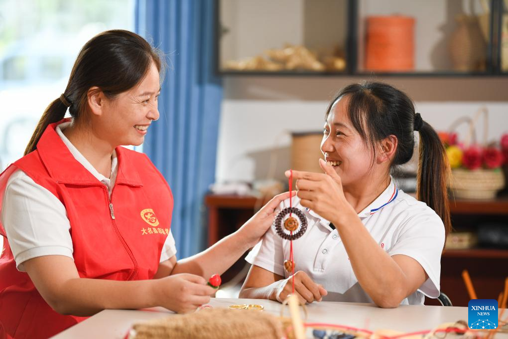 This photo taken on Sept. 20, 2025 shows Gu Sui (L), founder of Yushan Center, a local institution providing free straw plaiting training for people with disabilities, chatting with Li Peipei, a craftswoman working at the center, in Daming County, Handan City, north China's Hebei Province. (Photo by Dong Yuan/Xinhua)