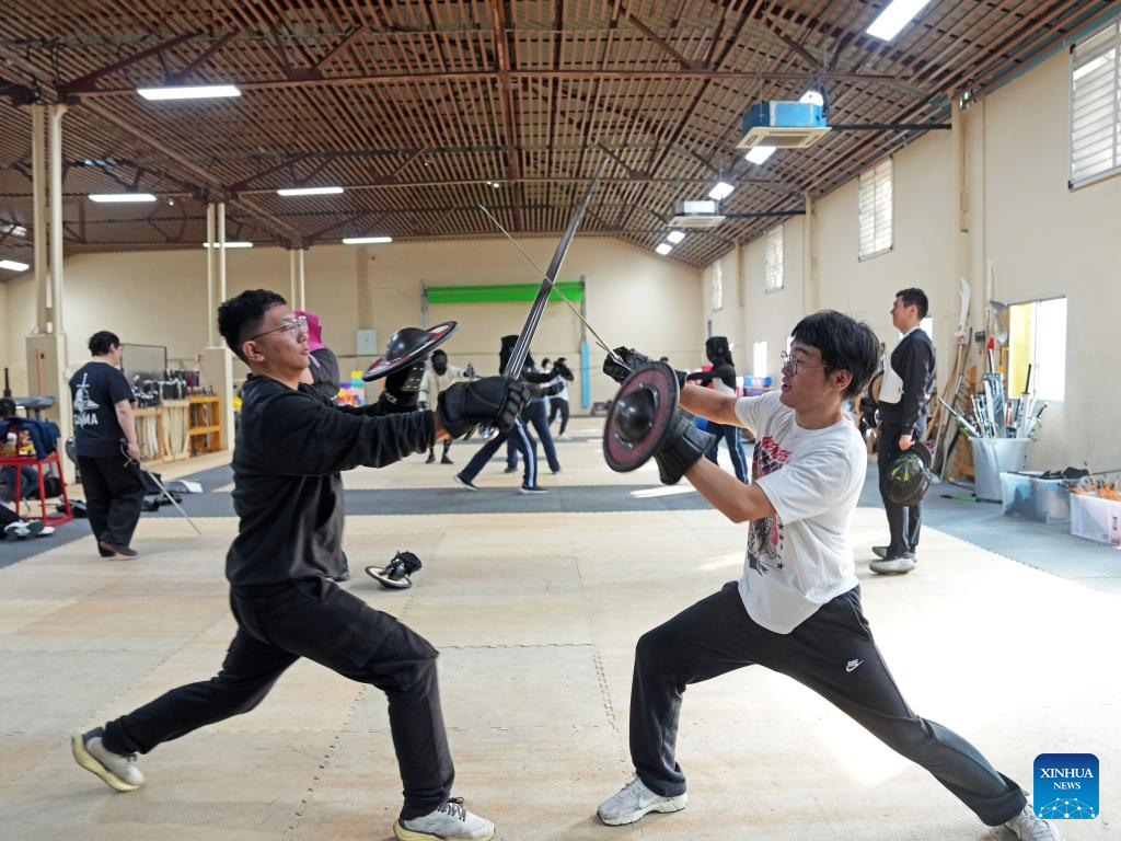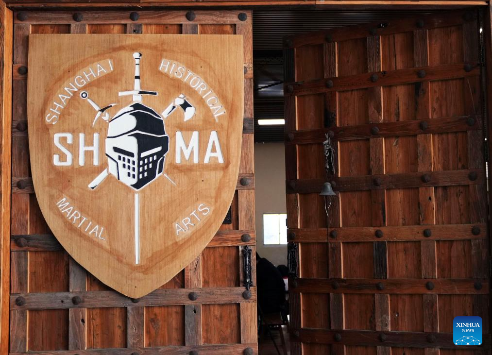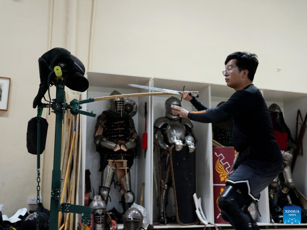 This photo shows a scene on a sword and shield course at the Shanghai Historical Martial Arts (SHMA) club in Shanghai, east China, Nov. 22, 2025. (Xinhua/Liu Ying)
