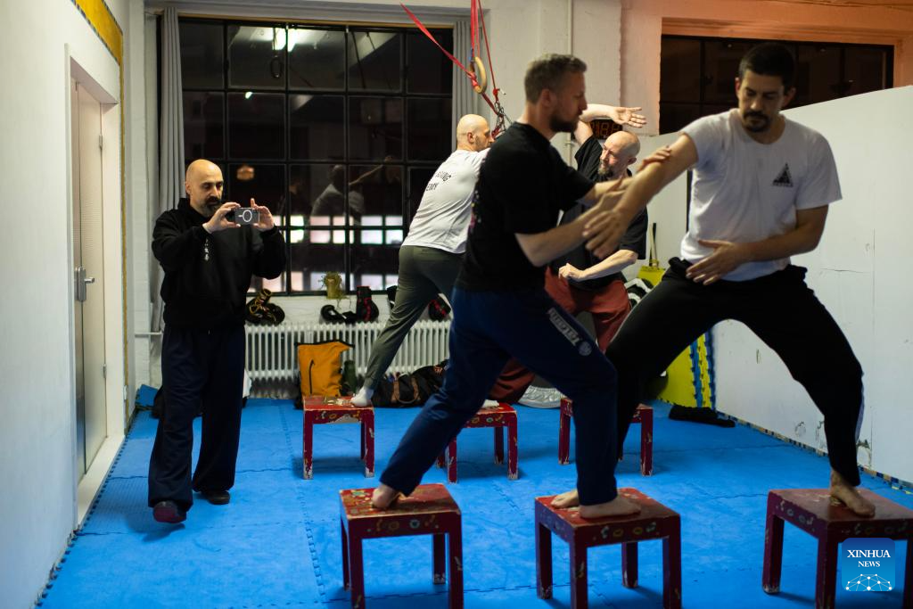 Ismet Himmet (1st L) records students practicing at XUAN-Gong Fu Academy in Berlin, Germany, Nov. 13, 2025. (Xinhua/Zhang Haofu)