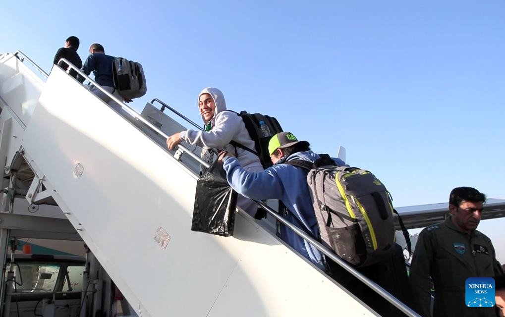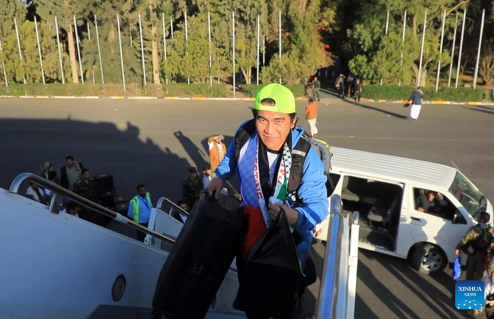 This video screenshot shows sailors of cargo vessel Eternity C boarding a plane at the Sanaa International Airport, in Sanaa, Yemen, on Dec. 3, 2025. Yemen's Houthi group on Wednesday released 10 sailors, including nine Filipinos, nearly five months after they were detained following the sinking of the cargo vessel Eternity C in the Red Sea off western Yemen. Al-Masirah TV, the Houthi-run channel, reported that the "crew of the Eternity C was released through Omani mediation and the sailors were transferred from Sanaa to the Omani capital Muscat." (Houthi Media Center/Handout via Xinhua)