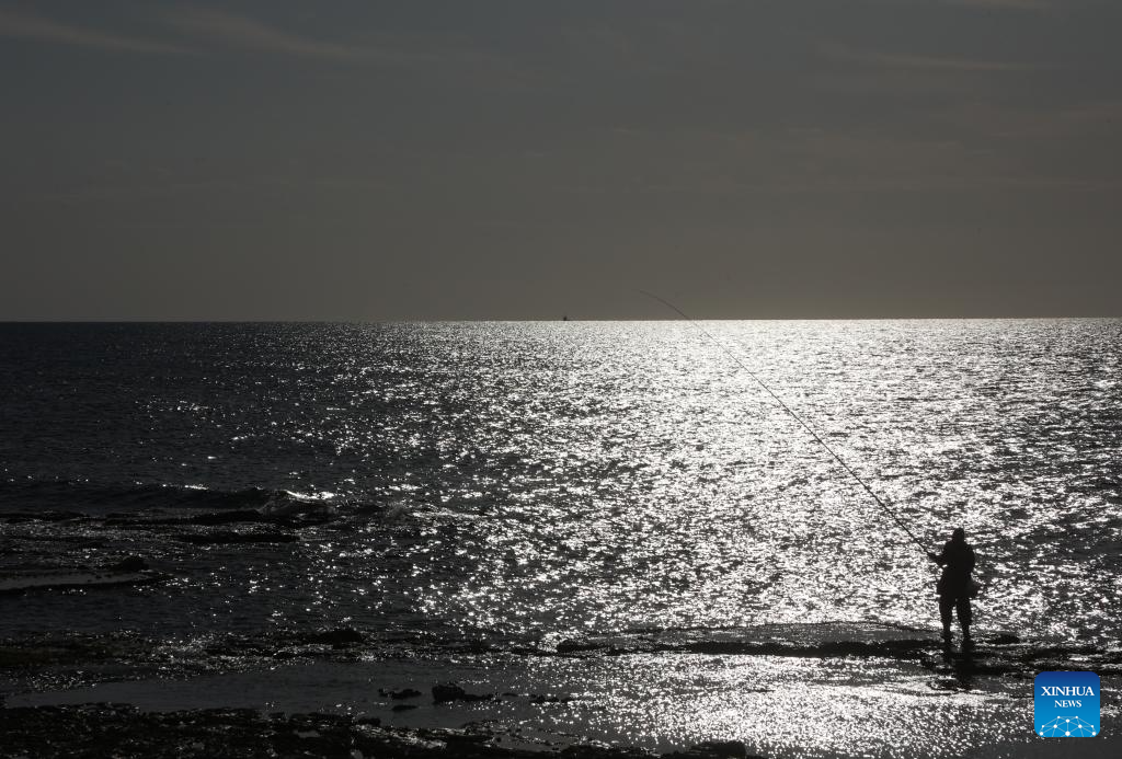 A man fishes on the beach in Haifa, northern Israel, Dec. 3, 2025. (Photo by Gil Cohen Magen/Xinhua)